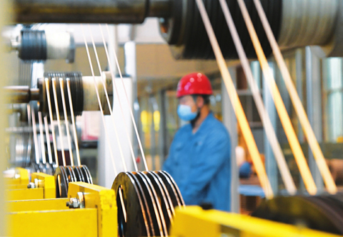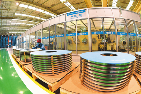 图为员工操作设备对钢卷进行分切。王旭宏摄