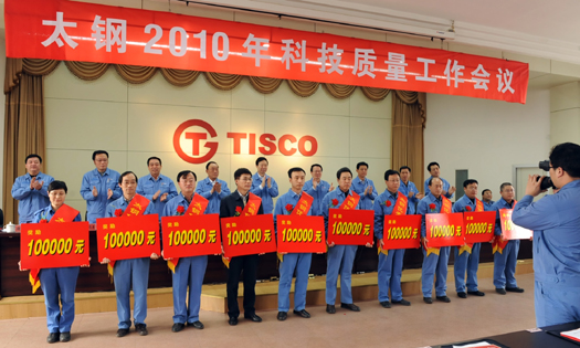 不锈钢股份公司总经理刘复兴在会上宣读了表彰决定。大会对2009年度重点产品SBU、炉料结构优化提质降本SBU、质量工作先进单位、质量-成本最佳操作者/管理者、省部级以上科技成果、太钢科学技术奖、优秀科技人员进行了隆重表彰奖励。其中,技术中心不锈钢研发室、高级工程师李国平,技术中心物理室光电组组长、教授级高级工程师张寿禄,二钢厂副总工程师、工程师陈景锋,热连轧厂生产技术科副科长、高级工程师赵新刚,自动化公司ERP项目组、高级工程师张长红,设计院动力室、高级工程师王立群,装备部工建炉窑室主任、高级工程师祁伟林,峨口铁矿项目部、高级工程师杨运江,临钢技术中心、工程师陆淑娟,太钢总医院心内科导管室主任、主任医师王慧峰10名优秀科技人员受到每人10万元重奖。