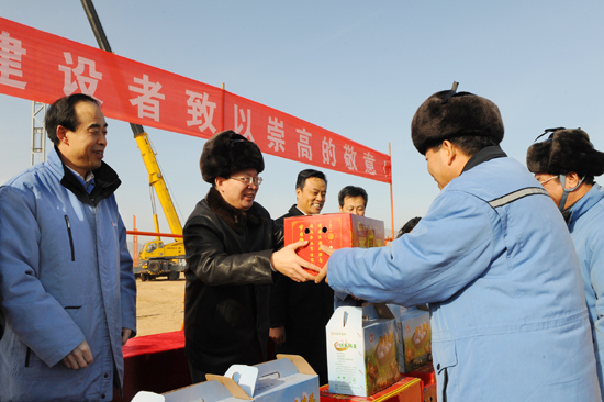 在采场施工现场,李晓波代表太钢向广大建设者致以亲切的慰问,并勉励工程建设者要克服严寒、施工条件差等不利因素,严格抓好施工质量过程控制,加快工程进度,确保早日投产。