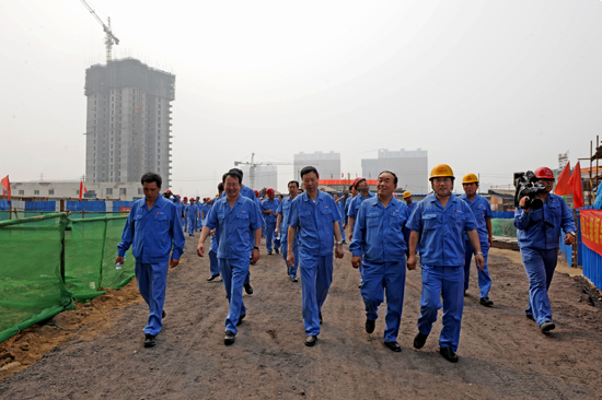 图为太钢领导在滨河小区建设现场检查工程进展情况。 王旭宏 摄